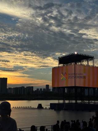 彩排当天的日落很美,夕阳映衬着2025成都世运会的标志,还有收到组委会准备的能量补给包