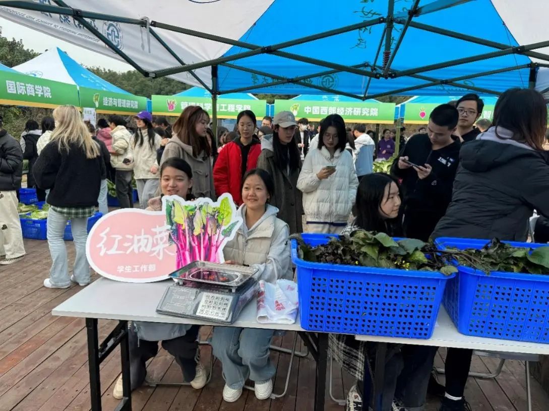 蔬菜采摘结束后,我院劳动实践队的同学们参加了学校举办的“SWUFE劳动集市”,整个集市上摆满了新鲜的蔬菜,琳琅满目。“数据伊甸园”的红油菜吸引了很多顾客,我院劳动实践队的同学们积极担任“蔬菜营业员”,热情地为前来购买的师生称重、装袋。在售卖活动中,同学们充分体验到劳动成果的甜蜜与价值。
