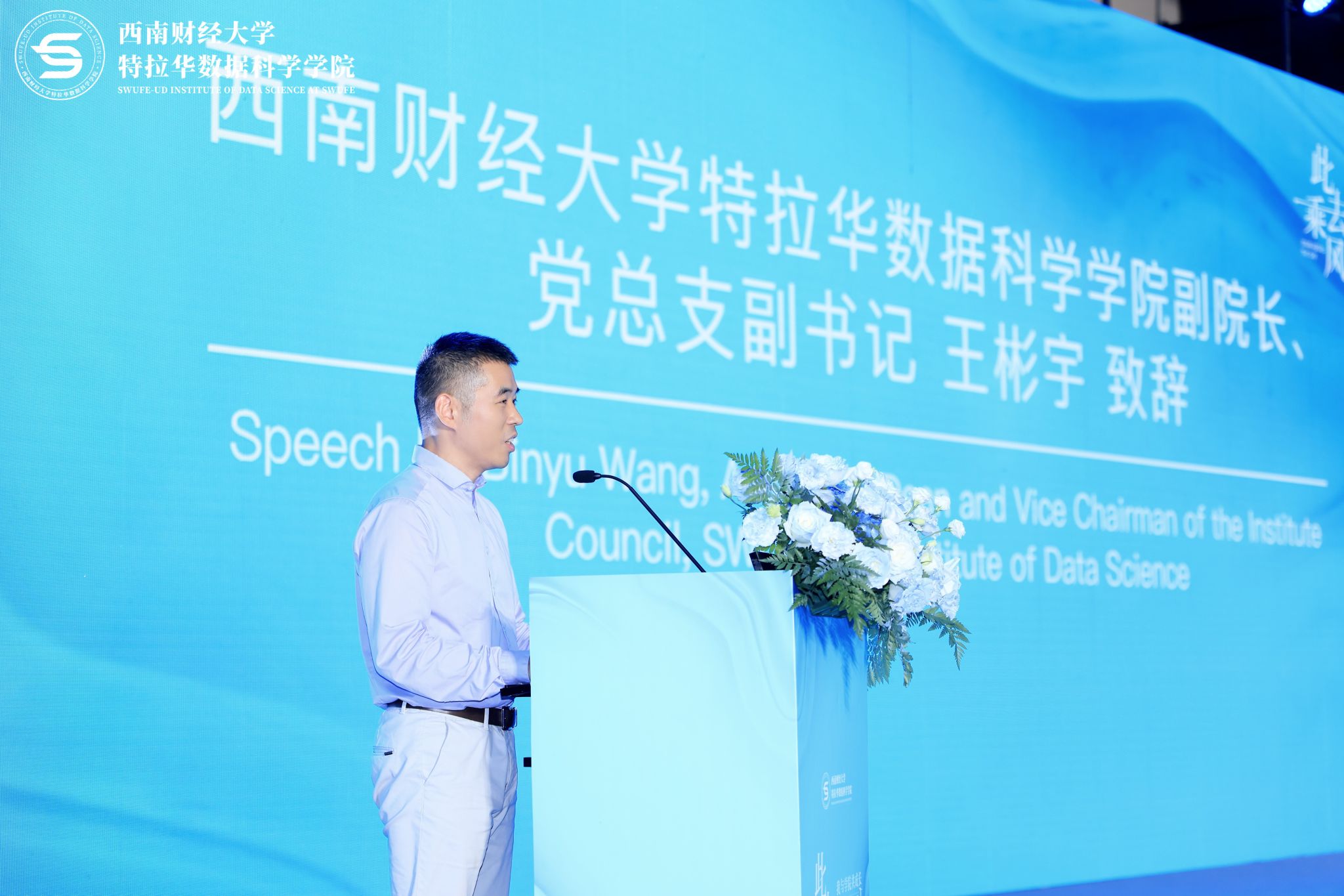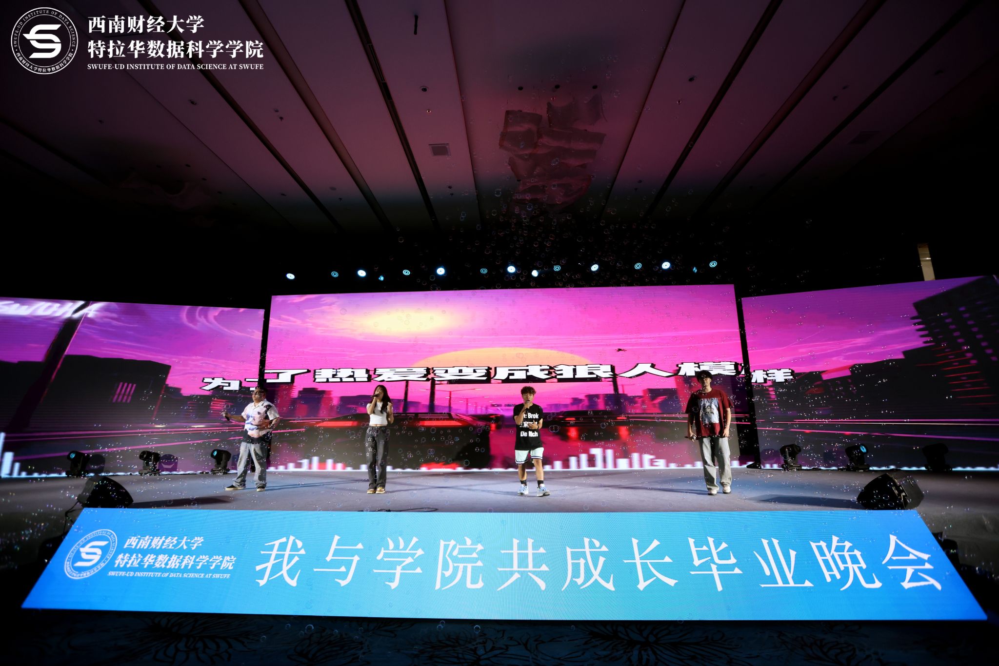 晚会伊始,王彬宇代表学院致辞,向毕业生们表示祝贺,对家长对学院的支持以及中外方同事们的辛勤付出表示感谢。他祝福同学们此去乘风,前程似锦,希望大家能够不忘来时路,胸怀凌云志,时刻铭记“自信自立厚植家国情怀,胸怀天下逐梦世界舞台”的理念,为中华民族伟大复兴的中国梦、为构建人类命运共同体的理想发出西财声音,贡献特院力量。
