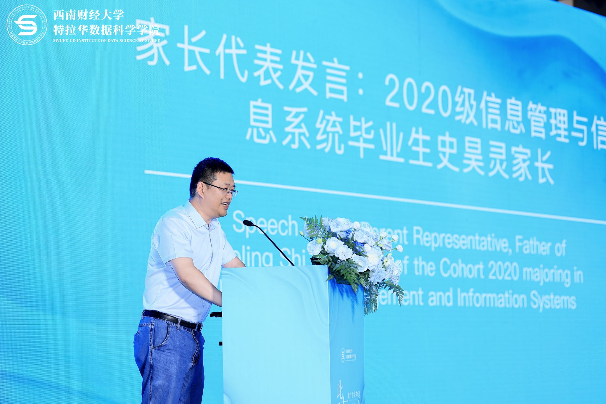 2020级信息管理与信息系统优秀毕业生史昊灵家长作为家长代表致辞。他在致辞中回顾了学生走过的大学时光,感谢学校、学院为同学们的成长发展提供了广阔的舞台,并鼓励同学们在今后的道路上牢记嘱托、奋勇前行。