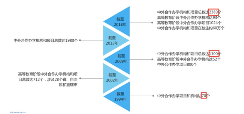 1994年时,中外合作办学项目和机构只有70个,截止到2018年,数量已经达到2389,合作办学的在校生约60万人(毕业生超过160万人),俨然成为一种新的教育趋势。