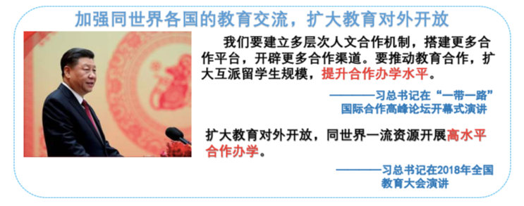习近平总书记对我国新时期教育合作办学明确提出了新形势下的新要求,要加强同世界各国的教育交流,坚定不移的扩大教育对外开放。