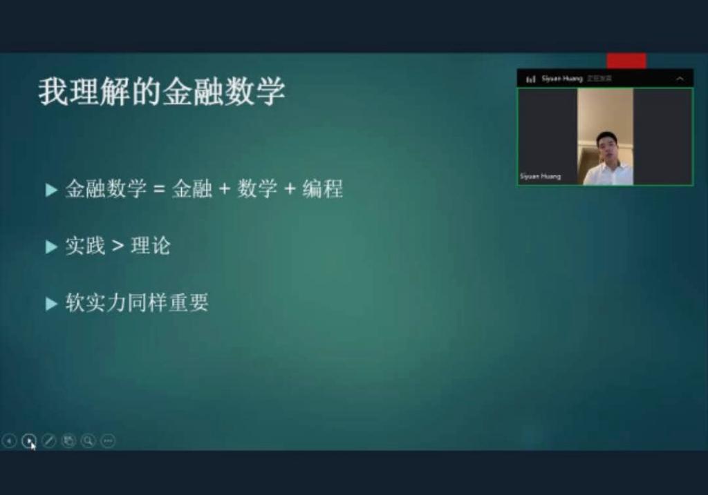 10月24日,成人小说 金融数学专业优秀校友、纽约花旗集团量化研究经理黄思源先生,以“不负韶华,未来可期”为主题开展线上讲座,与2020级金融数学专业的同学主要分享了专业学习、专业应用(量化交易方向)及方向与建议三部分的内容。同学们专心聆听,讲座后积极提问学长,收获良多。