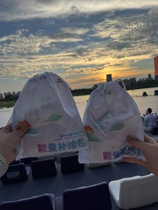 彩排当天的日落很美,夕阳映衬着2025成都世运会的标志,还有收到组委会准备的能量补给包