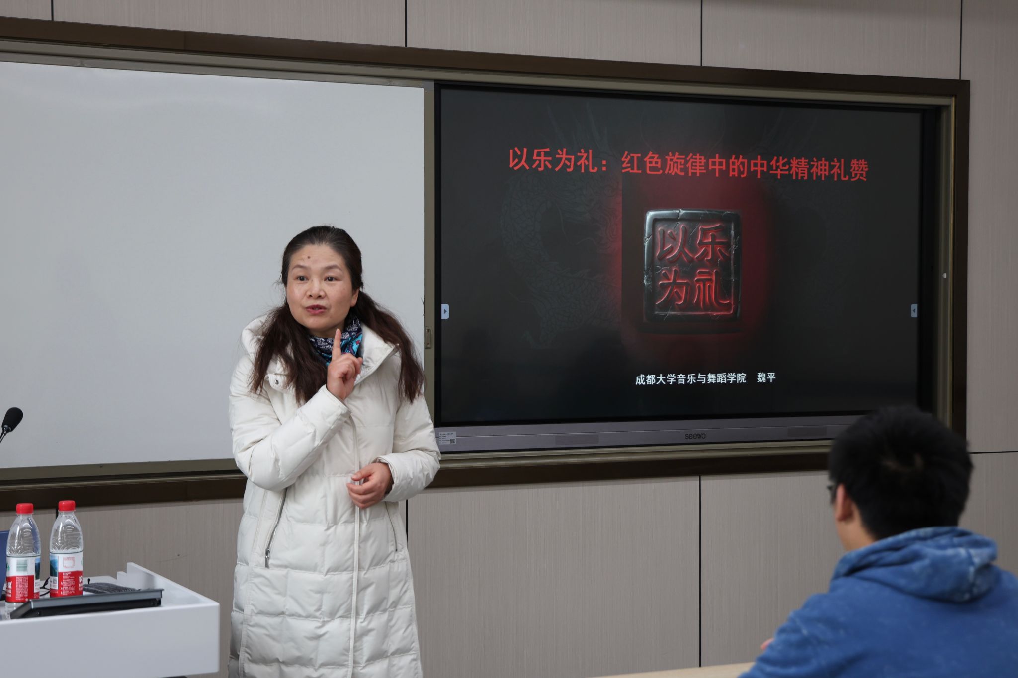 在经世楼C201举办“以乐为礼:红色旋律中的中华精神礼赞”素质文化讲座。活动特邀成都大学音乐与舞蹈学院教授魏平主讲,学院学生发展与办公室主任马蕾主持,全校学生共同参与。