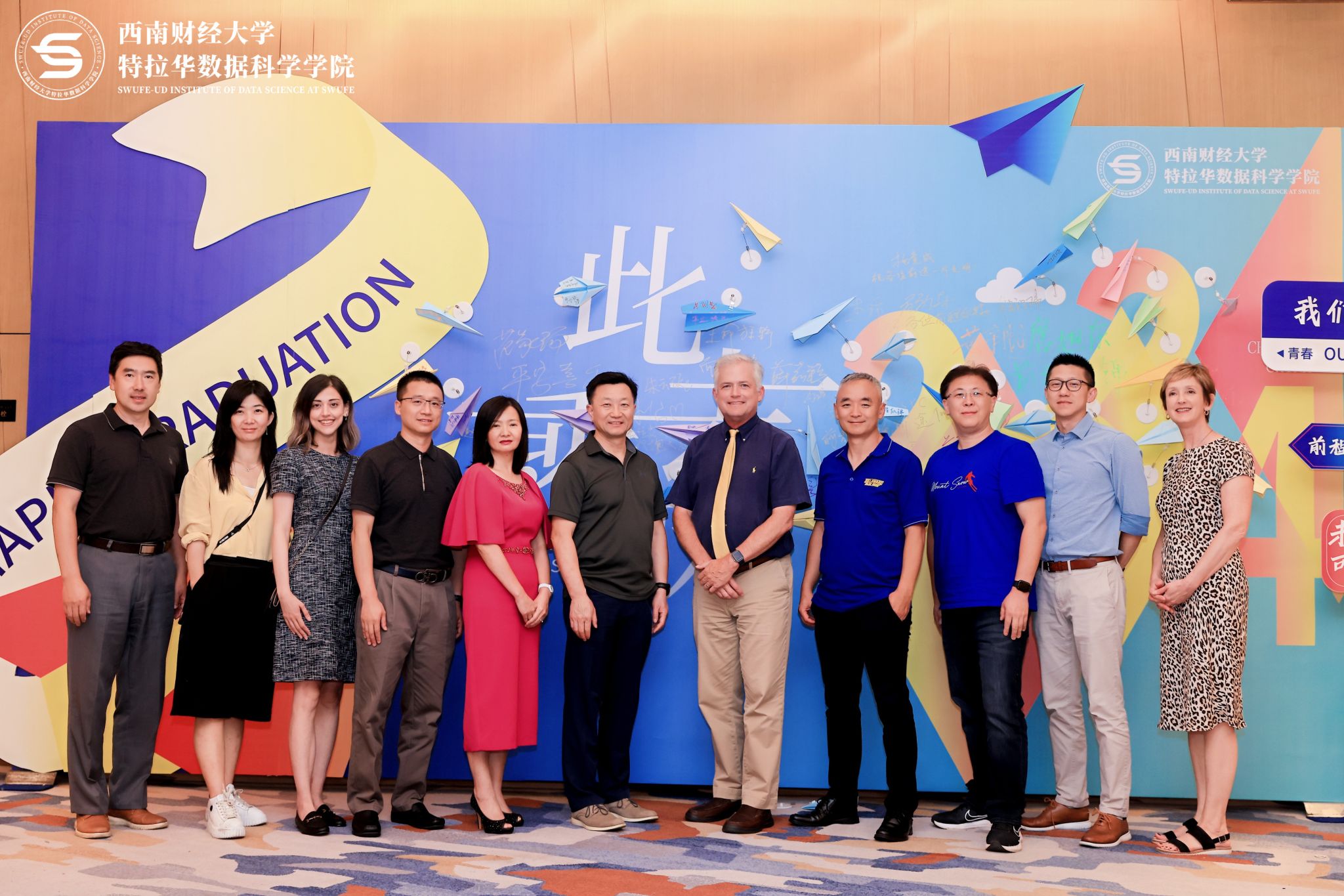 院长杨石磊、党总支书记王学钊、副院长兼党总支副书记王彬宇、学院项目主任廖毅、王宇、王磊、美国特拉华大学勒纳商学院院长Oliver Yao、资深副院长兼成人小说