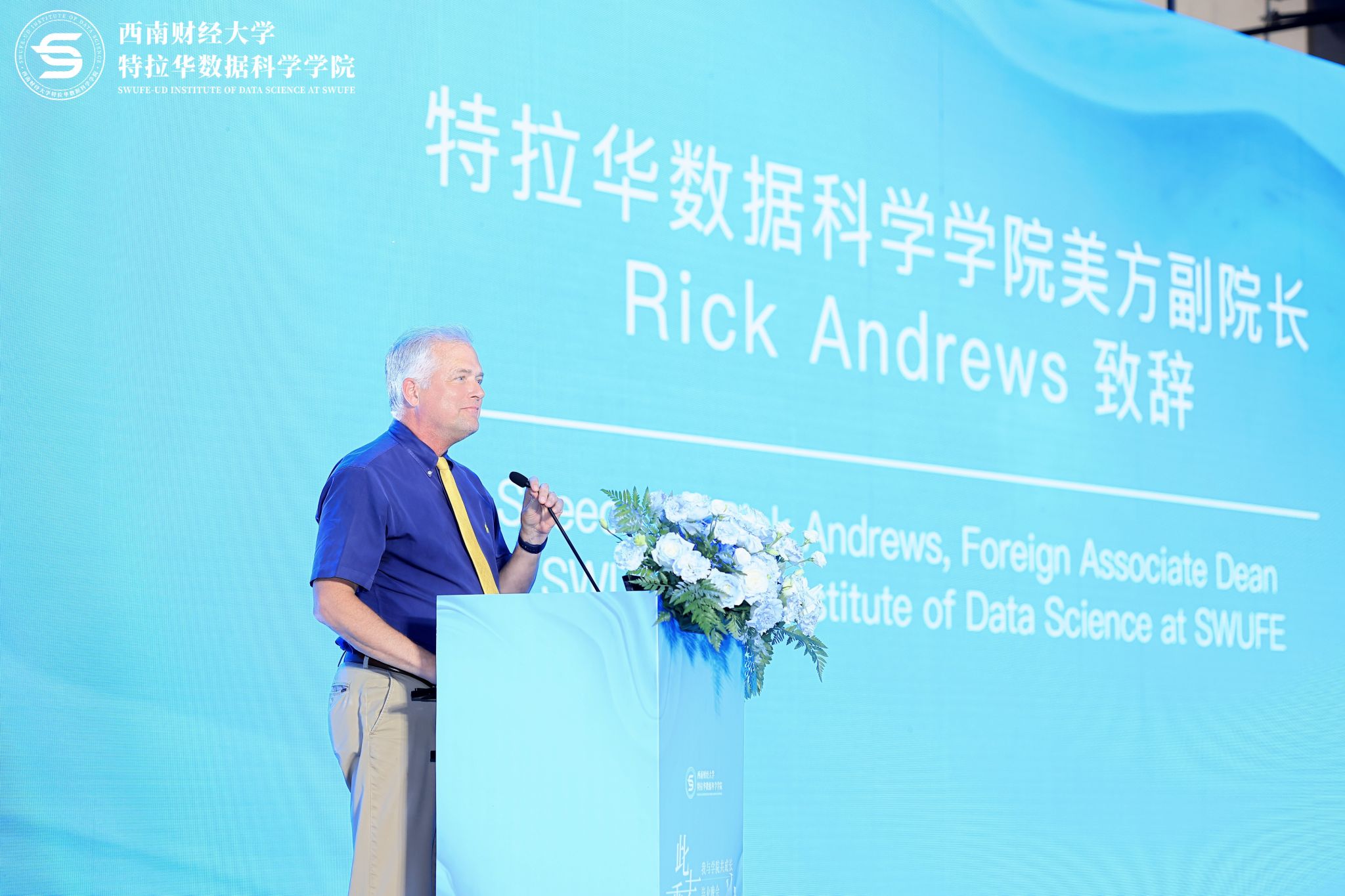 Rick Andrews代表特拉华大学致辞,祝贺同学们圆满完成学业。Rick Andrews在致辞中提到,自己作为第一批大学生,真正实现了教育改变命运,也希望同学们可以像他一样,用知识成就更加完美的人生。他祝愿同学们可以永葆青春激情,对未来的人生充满探索之心,勇攀高峰!