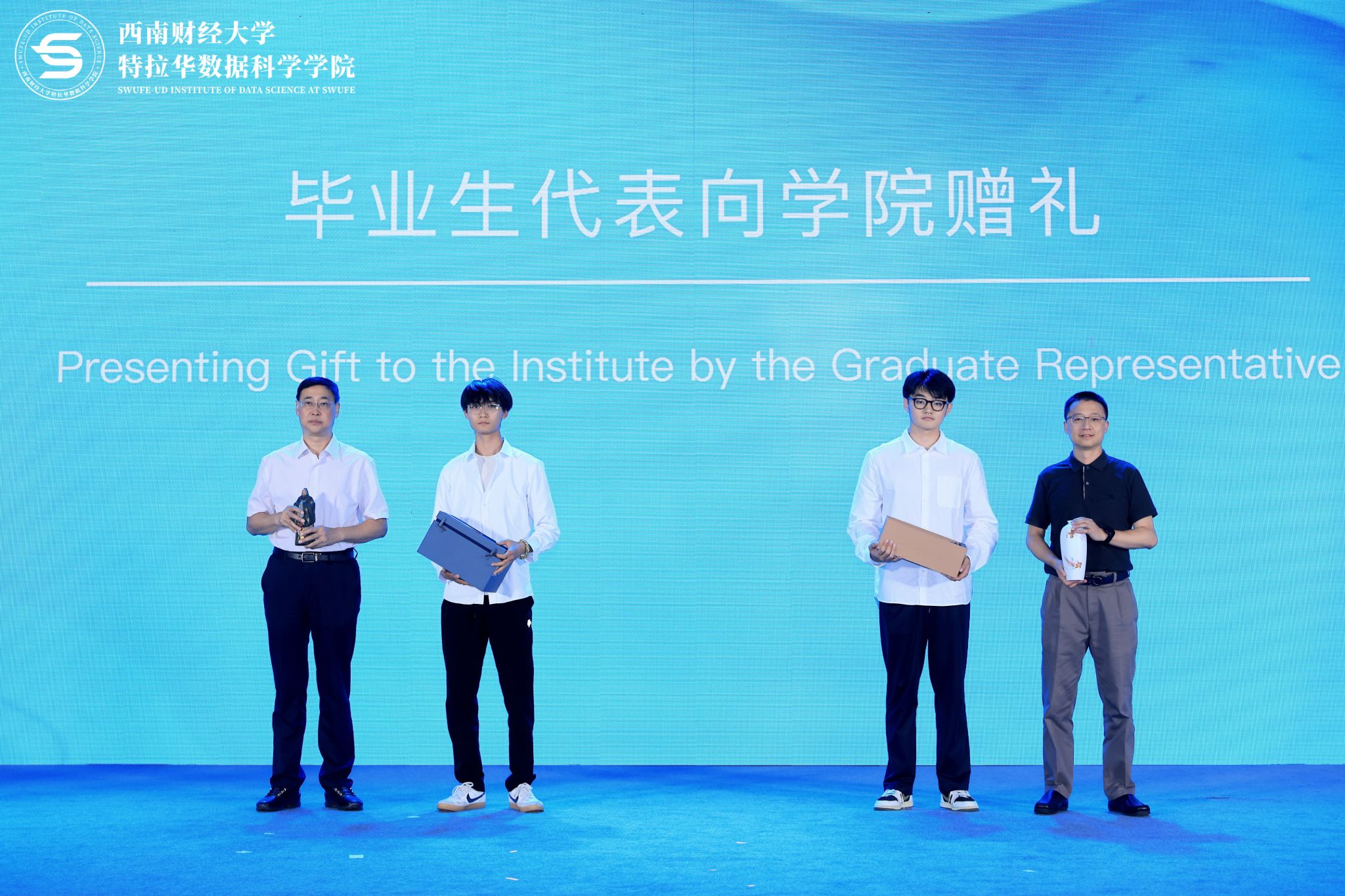 作为学院首届毕业生,2024届学生代表向学院献礼,通过这样的方式来表达对学院的感谢与惦念。随后,王学钊为2024届毕业生班级联络员颁发聘书,叮嘱同学们做好从学生到校友的角色转变,相约明年在西财百年校庆之际再回母校相聚。