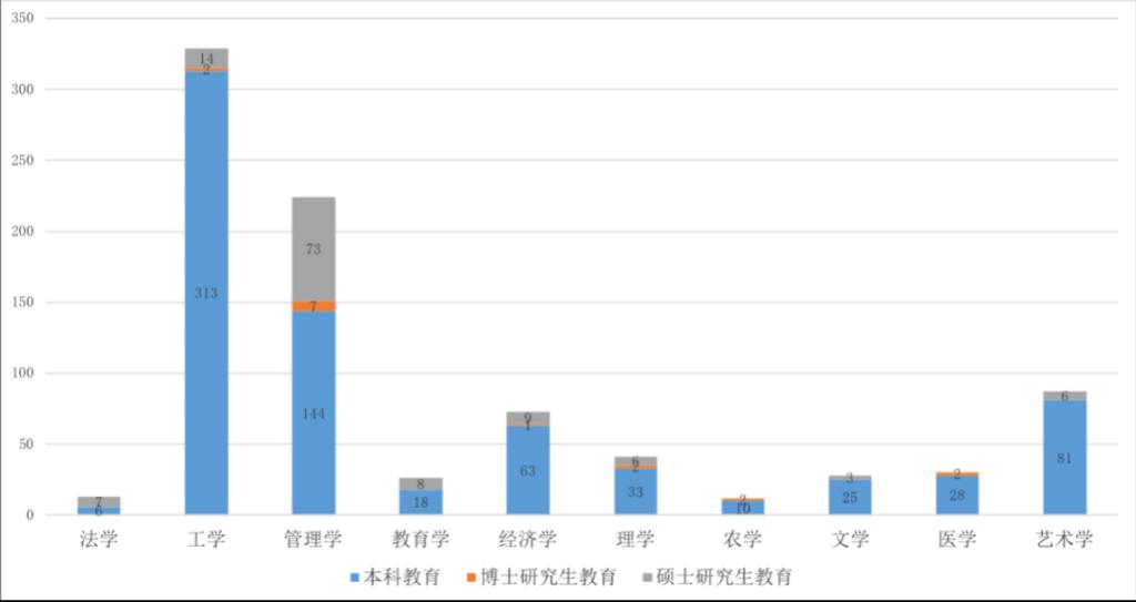 (1)工学类项目,数量超过总量三分之一(38.08%),办学层次主要集中在本科层次。
