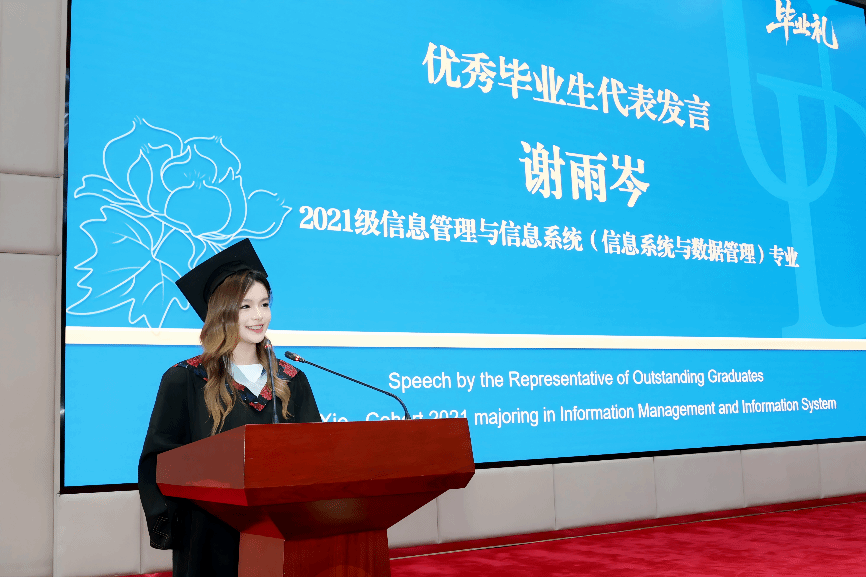 优秀毕业生代表、2021级信息管理与信息系统专业谢雨岑发言。她回顾了大学四年成长点滴,并感恩学院汇集中美两校丰富培养资源所赋予自己的强大底气,感谢特院这片“被允许笨拙、被包容脆弱、被期待绽放”的土壤培养的坚韧品格,并表示2025届毕业生们都将带着学校与学院的期许继续勇敢追寻梦想。