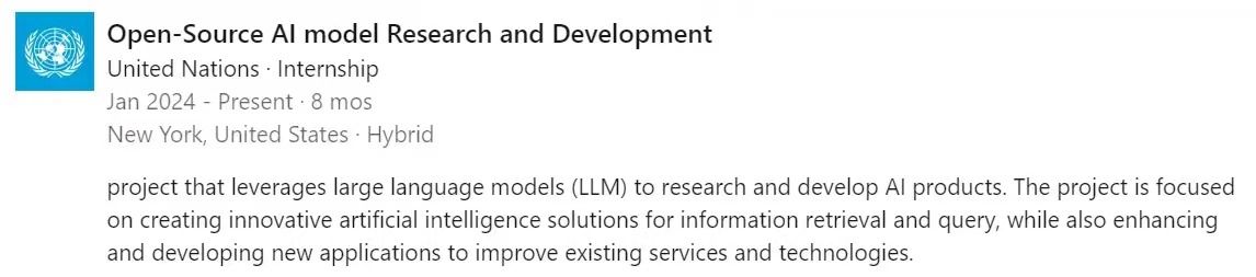 2024年春季学期,她在宾夕法尼亚大学交换学习,并成功进入联合国信息与通信技术总部(Office of Information and Communication Technology Department)实习,为期一年。