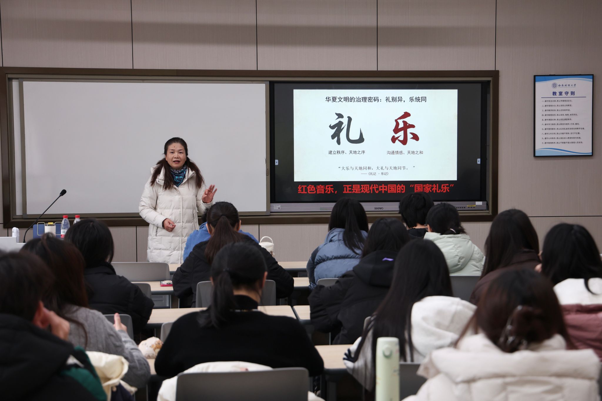 在经世楼C201举办“以乐为礼:红色旋律中的中华精神礼赞”素质文化讲座。活动特邀成都大学音乐与舞蹈学院教授魏平主讲,学院学生发展与办公室主任马蕾主持,全校学生共同参与。
